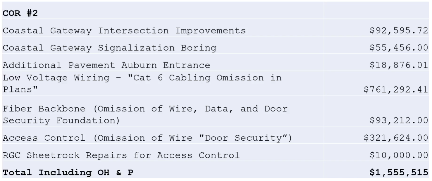 Public Works Director, Noel Hand, presented a construction change order for the new Gulf Shores High School. The current contract is at 607 days of a 690 day contract. March 11, 2026 is the scheduled completion date. The change order would provide an additional $1,555,515. The breakdown of the additional cost are outlined below: