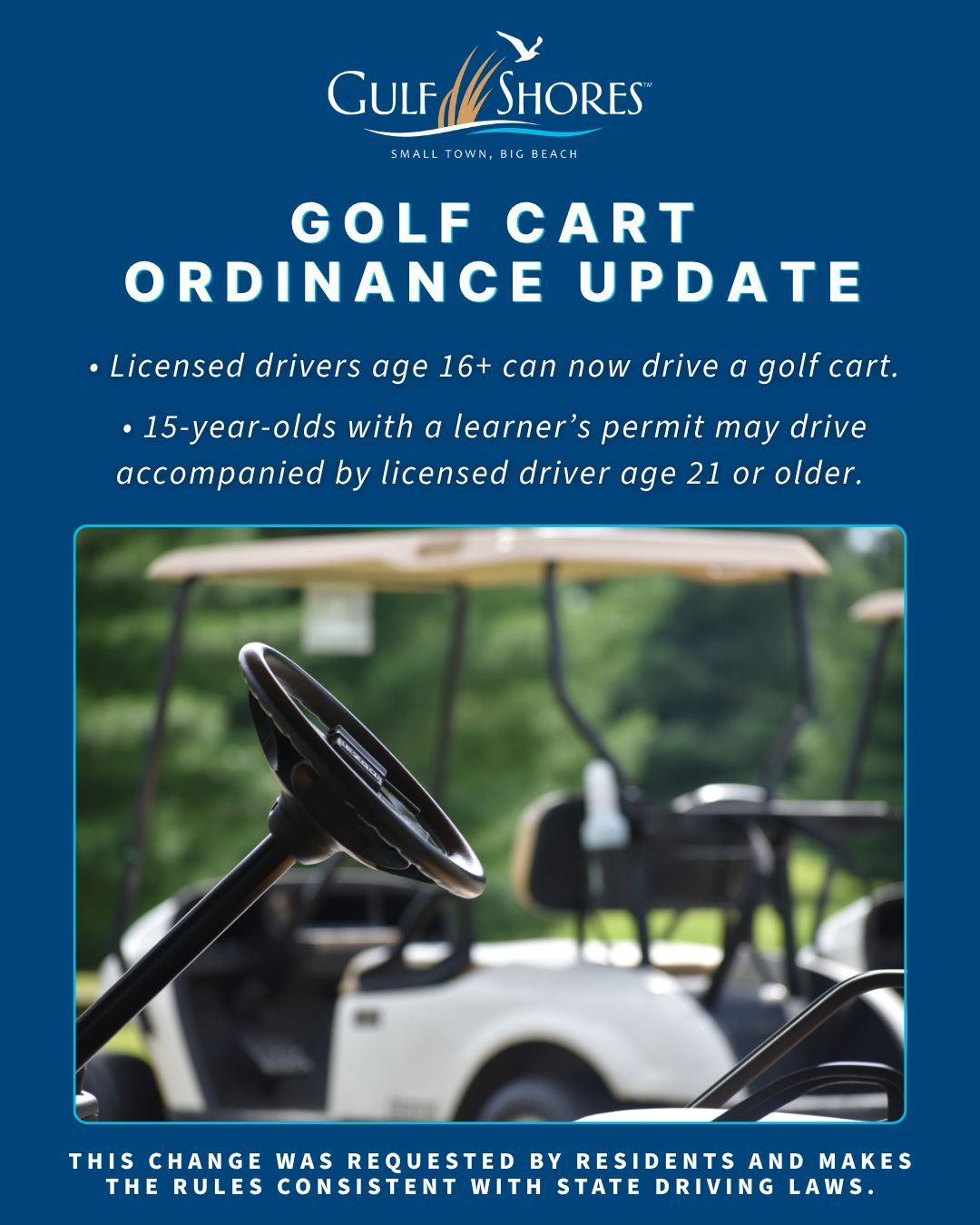 With the approved update, anyone who is legally allowed to drive a vehicle in Alabama may now drive a golf cart or LSV (Low-Speed Vehicle) in permitted areas.