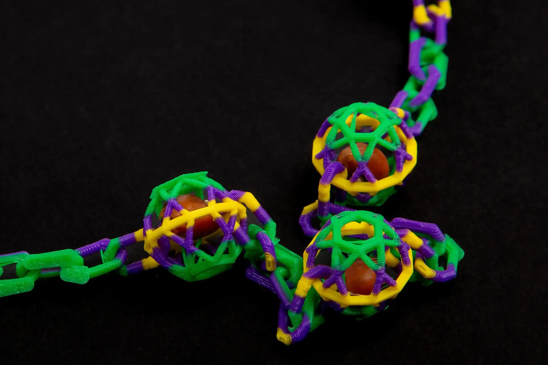 Many of the team’s bead designs include tiny cages where seeds can be placed during the process. As a bonus, the seeds will grow into Earth-friendly plants where the beads land and decompose, ideally in a pot or garden at the recipient’s home.