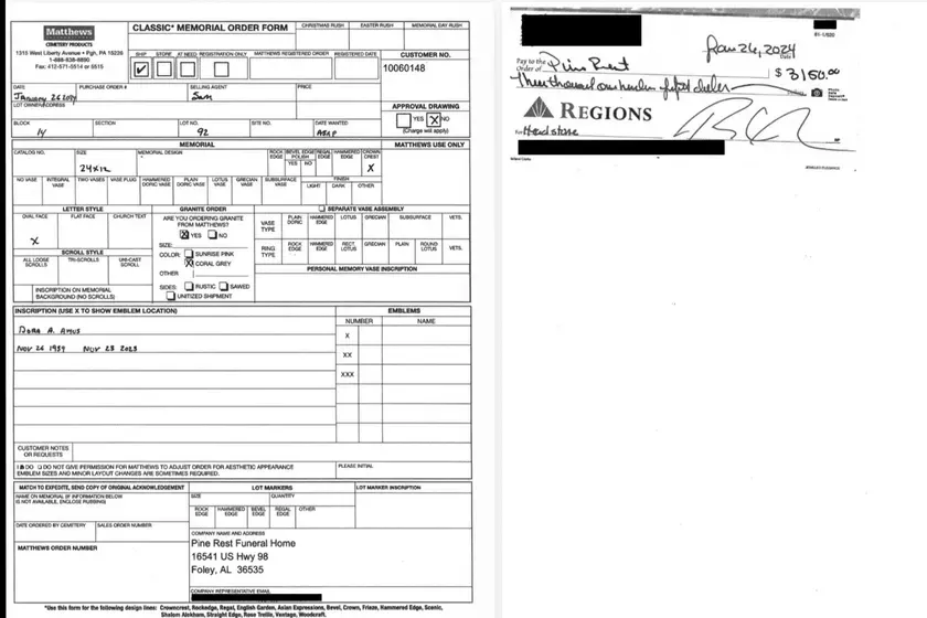 Tony and Deborah Nelson buried Deborah’s mother, Dora Amos, in the cemetery in November 2023. Tony Nelson said the family ordered and paid $3,150 for the headstone in January 2024 and was told it could take six to 18 months to receive it. Nelson provided a copy of the order form and canceled check to 1819 News.