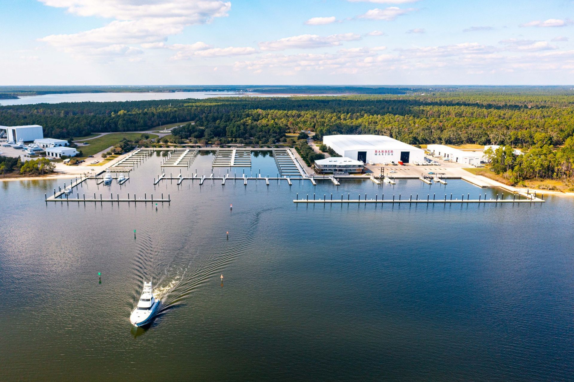 The Barber Marina has a similar vibe with antique boat motors adorning the walls and it commitment to construction excellence. The marina boasts a campus of 25+ acres of beautifully maintained landscaping, nestled within a larger 3,000 acre tract of company-owned land.
