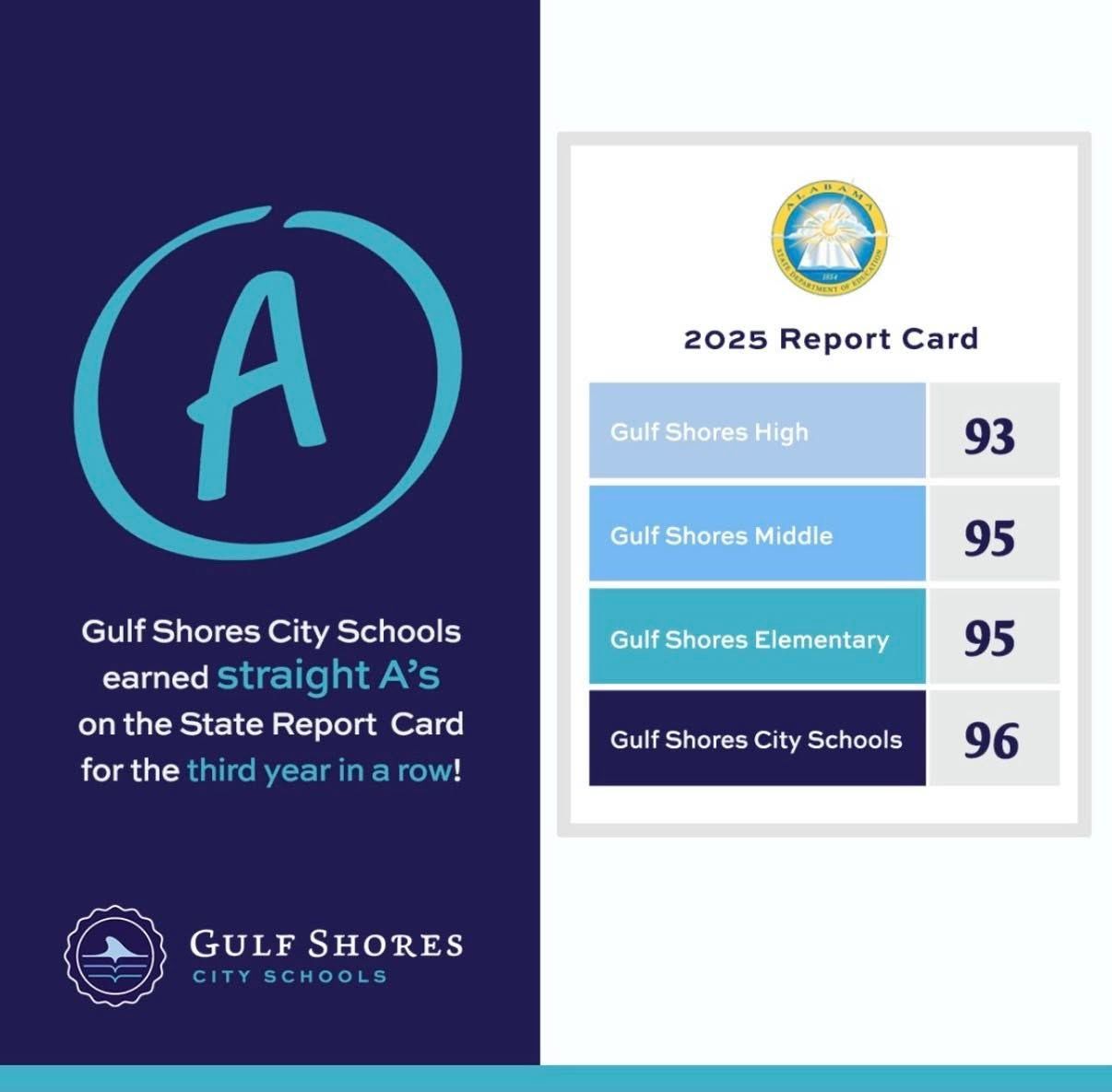 In the City of Gulf Shores education of the younger residents is always a top priority. With approximately 2,700 students across four schools the Gulf Shores School Board has reason to be proud of recent testing results. The State Department of Education released the 2025 Report Card and Gulf Shores received A's at each of their three schools. Best of all they have scored all A's for three years in a row.