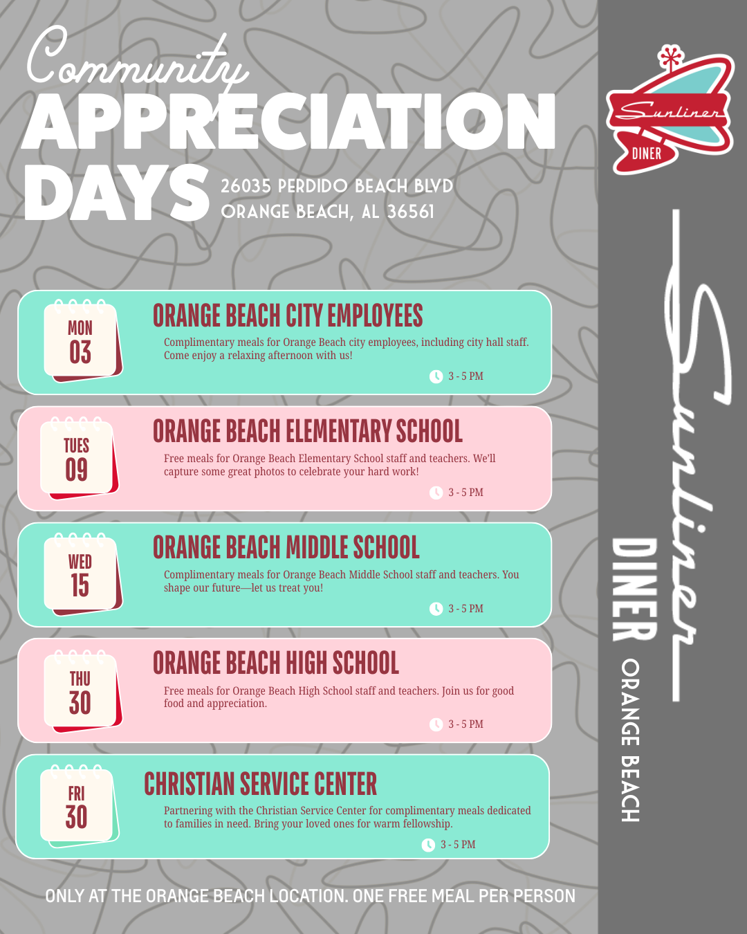 The celebration continues Wednesday, November 12, with meals for Orange Beach Middle School teachers and staff, recognizing their role in shaping young minds. On Thursday, November 13, the attention shifts to Orange Beach High School educators, who will be welcomed to the diner for free food and a well-deserved break.