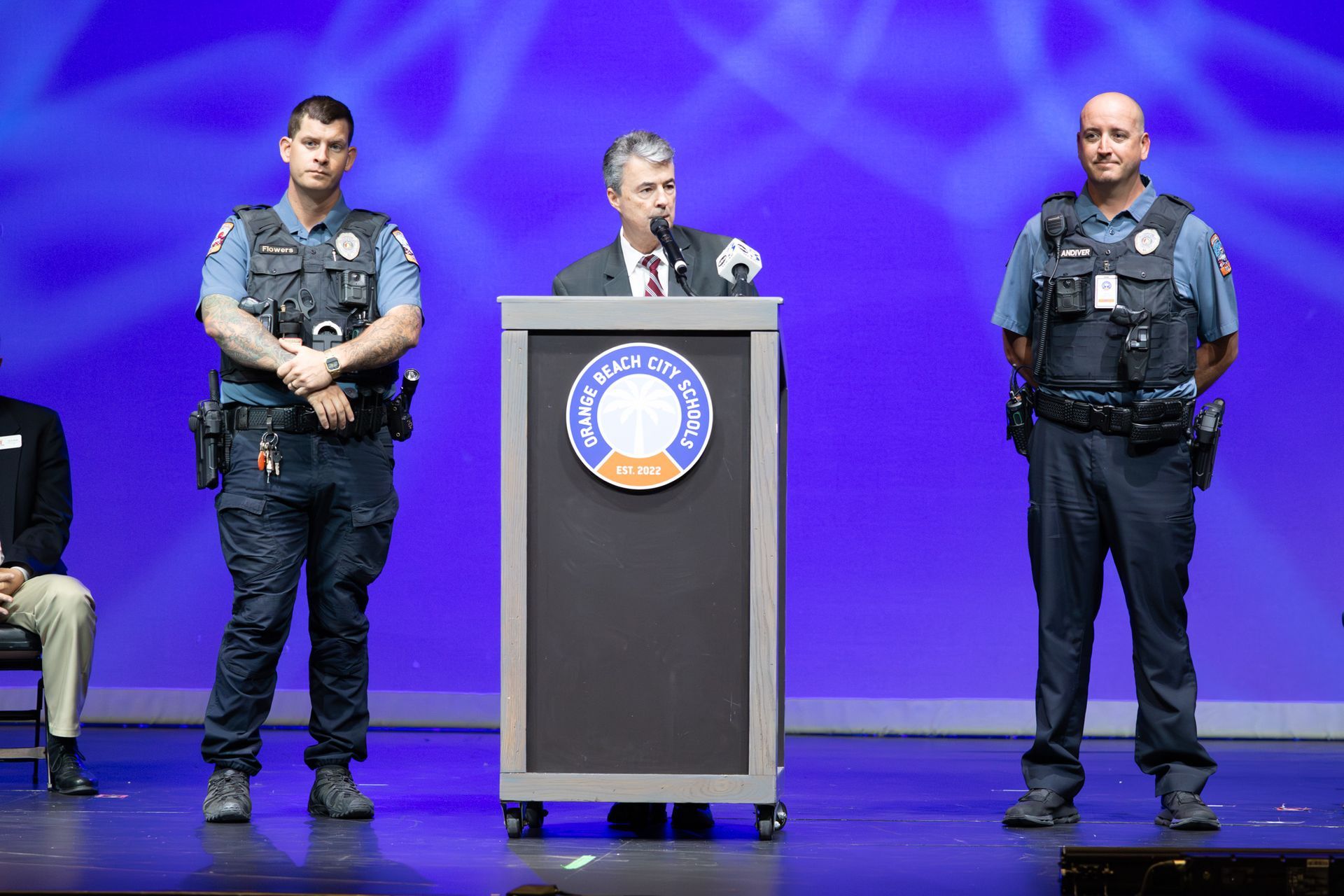 Principal Chris Shaw thanked Attorney General Marshall for his office's commitment to school safety throughout Alabama. Shaw acknowledged key individuals for their roles in maintaining school safety. These included Chief Johnson and the Orange Beach Police Department, Mayor Tony Kennon, city council members, school board members, and state leaders.