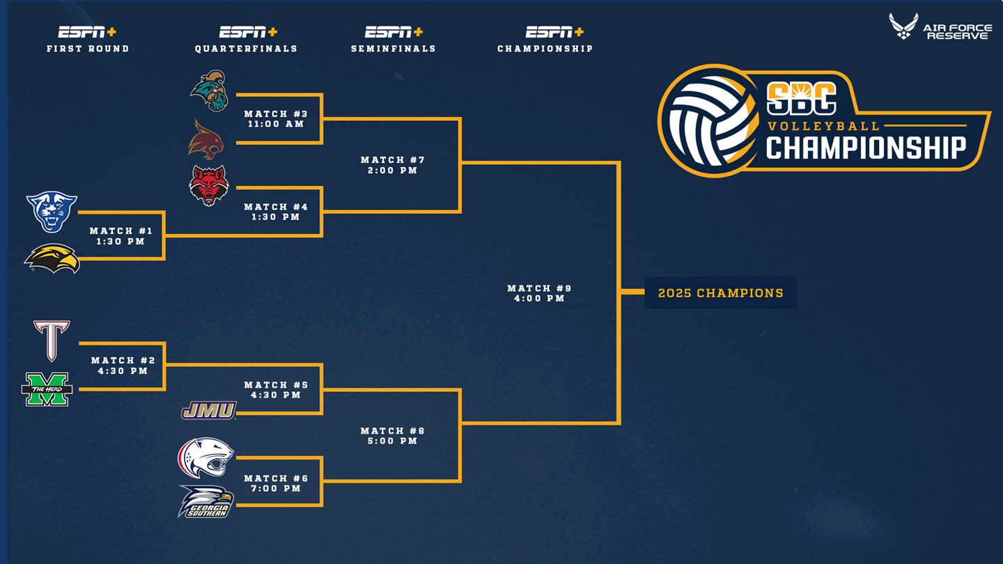 Action begins on Thursday, November 20, with a pair of first-round matchups. At 1:30 p.m. CT, fourth seeded Georgia State from the East faces fifth-seeded Southern Miss from the West in Match 1. Later that afternoon, at 4:30 p.m. CT, fourth-seeded Troy from the West meets fifth-seeded Marshall from the East in Match 2. Both contests will air on ESPN+.